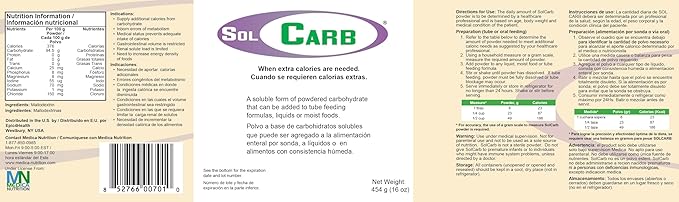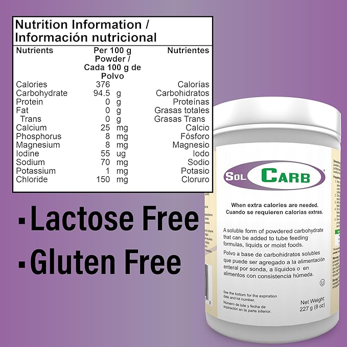 - SolCarb Unflavored Carbohydrate Powder Supplement, 454g Can – Easily Mixes into Liquids and Foods, Lactose-Free, Gluten-Free