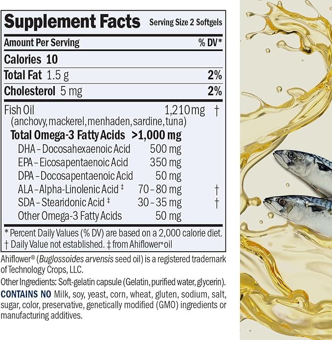 - SUPERIOR 100% PURE BIO-ACTIVE INGREDIENTS – Highly concentrated, ultra-pure fish oil provides Omega-3’s including DHA-Docosahexaenoic Acid, EPA-Eicosapentaenoic Acid and DPA-Docosapentaenoic Acid, along with plant-based Omega-3 fatty acids from Ahiflower Oil. Contains NO Milk / Dairy-Free, Gluten Free; NO soy, yeast, corn, wheat, sodium, salt, sugar, starch, emulsifier, wax, binder, filler, excipient, lubricant, coating, diluent, flowing agent, color, sweetener or preservative.