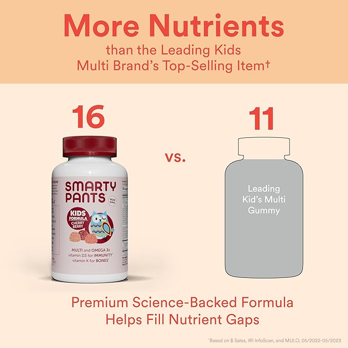 - PREMIUM, SCIENCE-BACKED KIDS MULTI: Kids Cherry Berry contains more nutrients than the leading kid’s multivitamin brand’s top seller+ and is formulated to help fill kids' common nutrient gaps. Based on $ Sales, IRI InfoScan, and MULO, 05/2022-05/2023