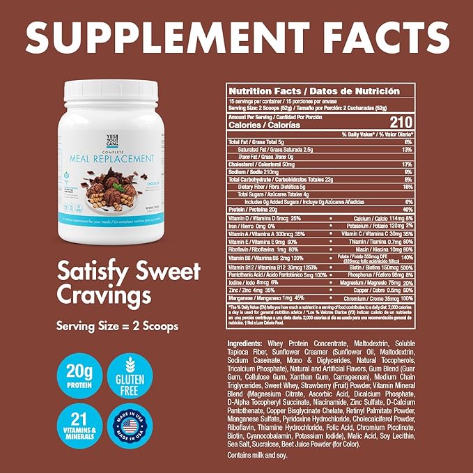 - COMPLETE MEAL ON THE GO: As an all-in-one nutritious meal replacement, Yes You Can! offers you a complete meal on the go. Our replacement shake contains proteins, healthy carbs, fiber, and nutrients. You can bring this shake with you anywhere and enjoy it when hunger strikes whether at the gym, in the office, or in your car.
