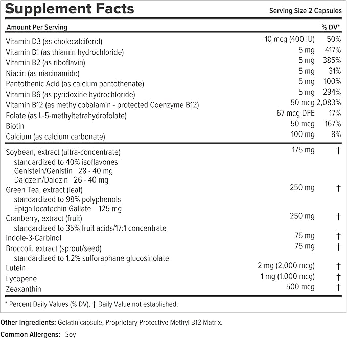 - SUPERIOR PURE BIO-ACTIVE INGREDIENTS – Delivers high levels of beneficial isoflavones from Soy (Genistein and Daidzein), Vitamin D3, Calcium, Green tea extract with 125 mg EGCG, sulforaphane from Broccoli extract, Cranberry extract, Lutetine, Lycopene, Zeaxanthin, Natural B12 (Methylcobalamin) and Folate Complex. Contains NO Milk / Dairy-Free, Gluten-Free; NO yeast, wheat, sodium, salt, sugar, fat, cholesterol, color, preservative or manufacturing additives. Contains Soy.