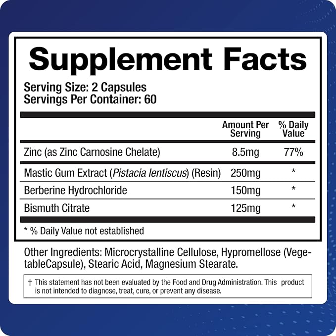 - ZINC CARNOSINE AND BERBERINE – Zinc carnosine is known for its potential to deter H. pylori and speed up tissue healing in gastric environments. Berberine sulfate is a botanical extract with protective properties and the ability to calm irritations.