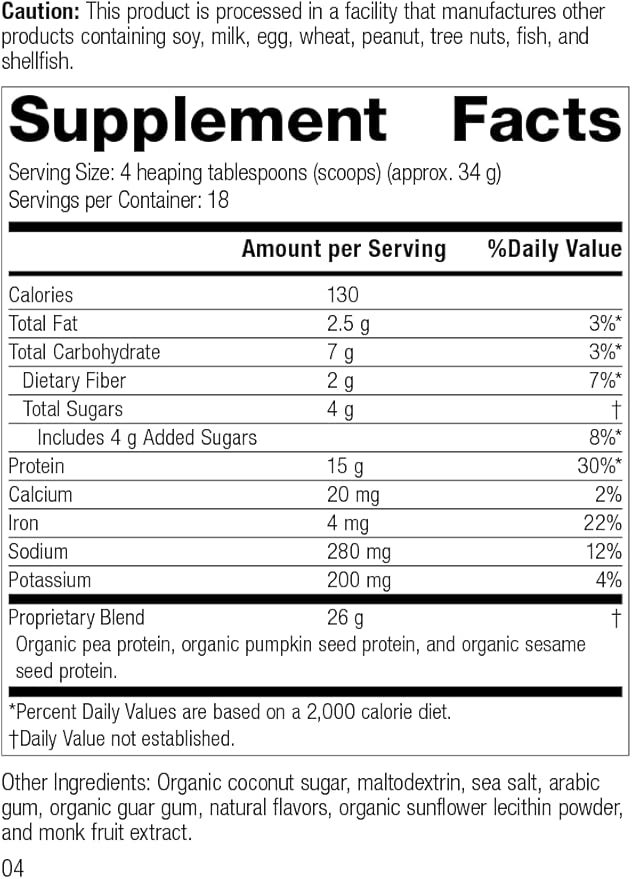 - The blend of organic pea protein, organic pumpkin seed protein, and organic sesame seed protein is a valuable source of several amino acids including the nine essential amino acids