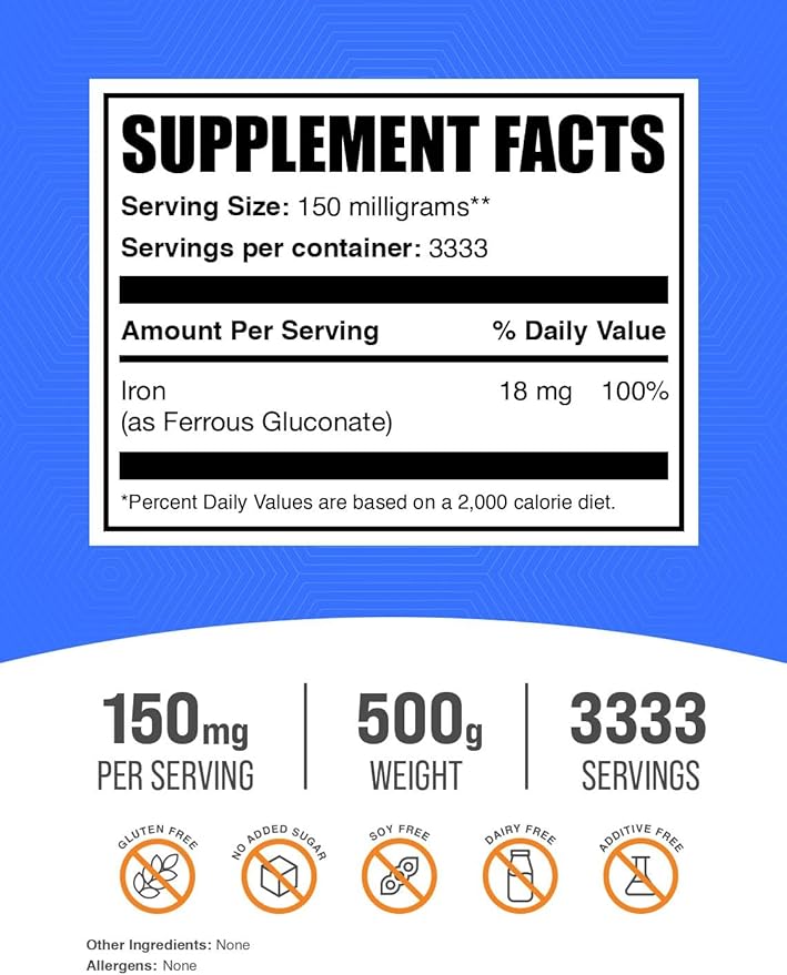 BulkSupplements.com Ferrous Gluconate Powder - Essential Mineral for Energy, Iron 18mg - Iron Supplements, Gluten Free, 150mg per Serving, 500g (1.1 lbs) (Pack of 1)