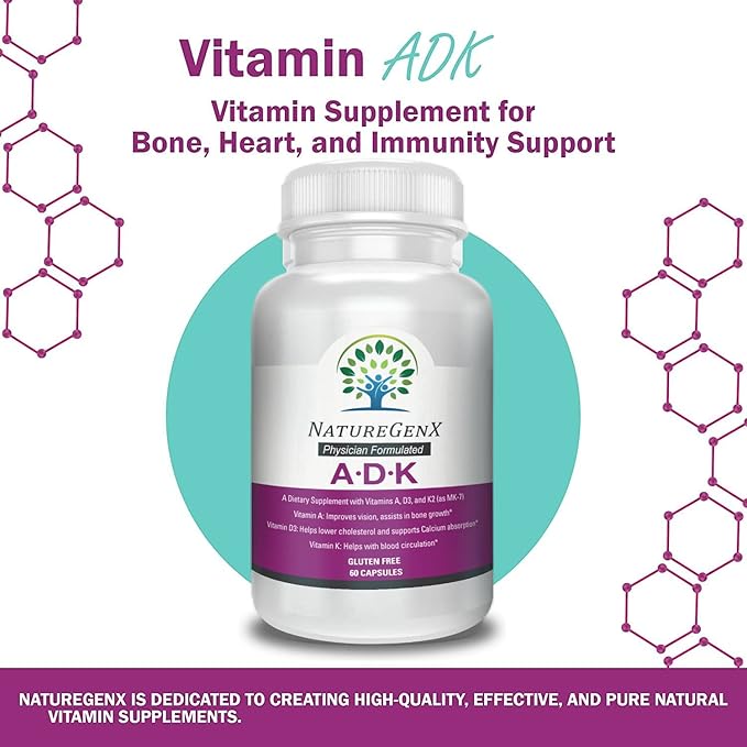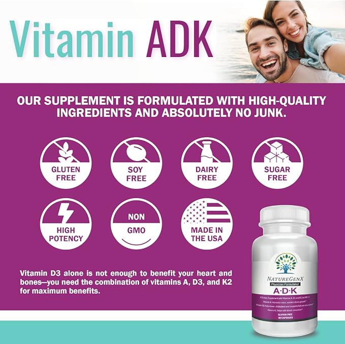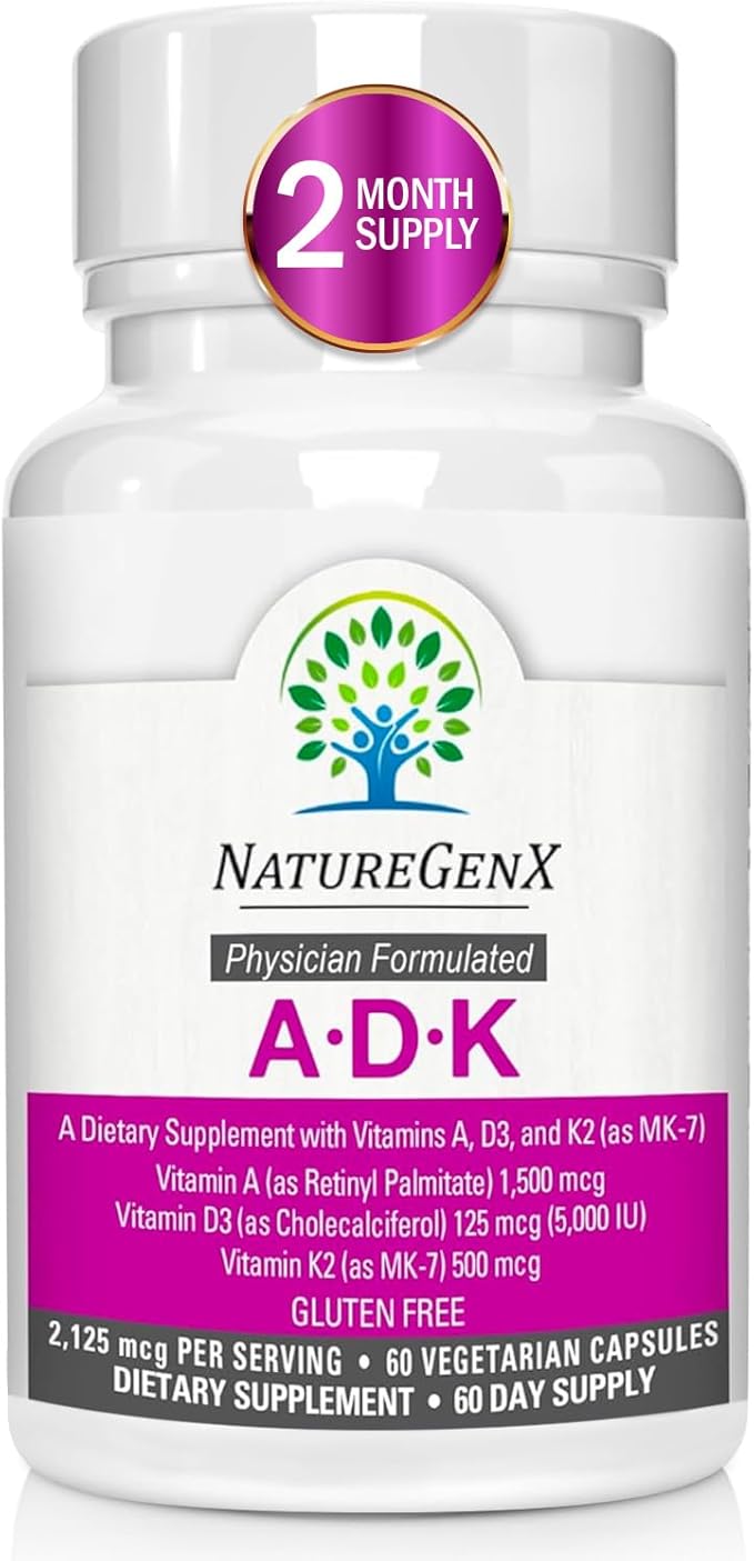 - COMPREHENSIVE VITAMIN ADK SUPPLEMENT: NatureGenX brings you a powerful A D K vitamin supplement, meticulously crafted with Vitamin A 5000 IU, Vitamin D3 5000 IU, and Vitamin K2 500 mcg as MK-7. This potent blend is tailored to bolster your bone health, heart function, and immune system, ensuring a holistic approach to your well-being.