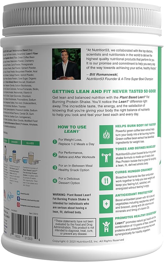 - BOOST ENERGY WHILE BURNING BODY FAT: Nutrition53 Lean1 plant based is a perfect combination of fat burning ingredients that will help you achieve the desired body size and shape; the powder aids in burning fat while increasing metabolism and energy to keep you going all day