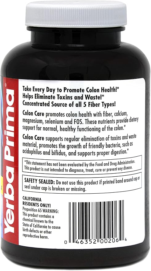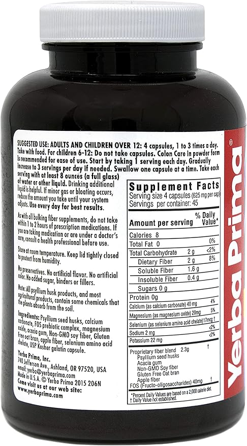 Yerba Prima Prebiotic Colon Care Capsules - 180 Count (Pack of 2), Gluten Free, Proudly Made in The USA, Non-GMO, Soluble & Insoluble Fiber, Supports A Healthy Functioning Colon