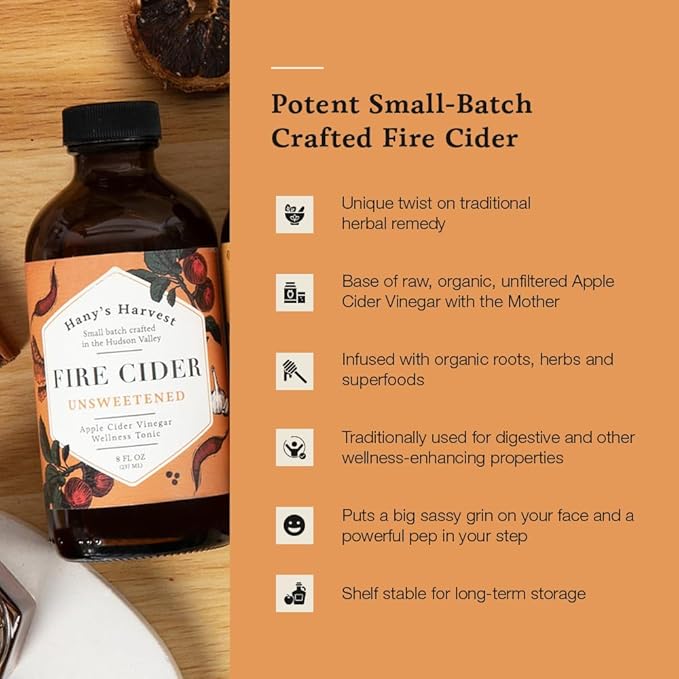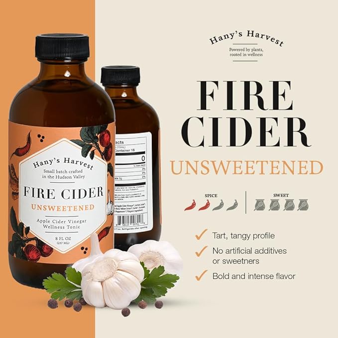 - Hany's Harvest Unsweetened Fire Cider: Our Apple Cider Vinegar is a meticulously handcrafted tonic made from apple vinegar, organic unsweetened ingredients, and a blend of natural spices. This carefully crafted small-batch wellness tonic elixir supports your immune system and aids digestion, offering a bold and spicy flavor that adds a zesty kick to your daily wellness routine.