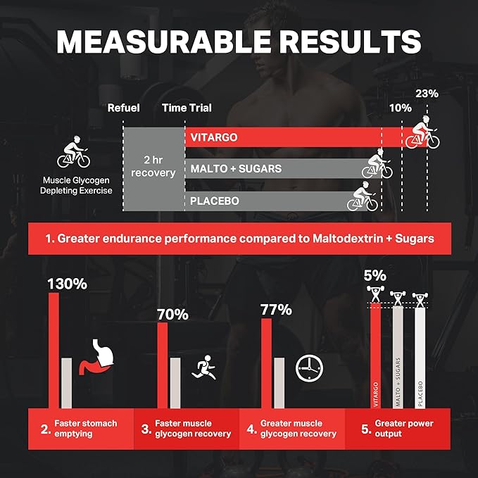 - GETS INTO MUSCLE FASTER The 3rd-party, peer-reviewed research showed Vitargo to have 1.7x faster glycogen re/fueling than maltodextrin + sugars after exhaustive workouts. By replenishing muscle glycogen greater and faster than other carbohydrates and proprietary blends, athletes are able to optimize their training sessions for peak performance.