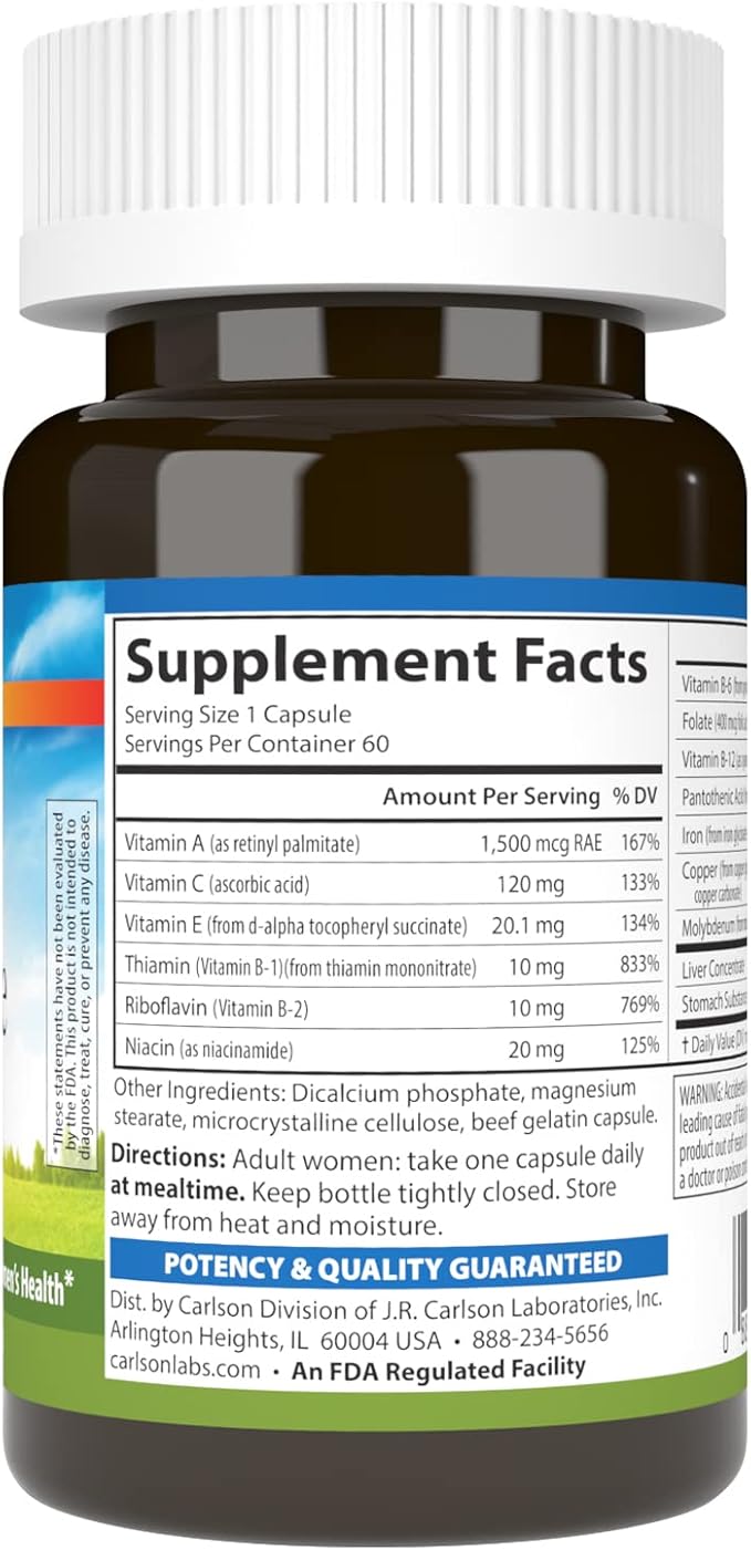 Carlson - Women's Iron Restore, 28 mg Iron + B Vitamins, Menstrual Support, Iron Absorption & Women's Health, 60 Capsules