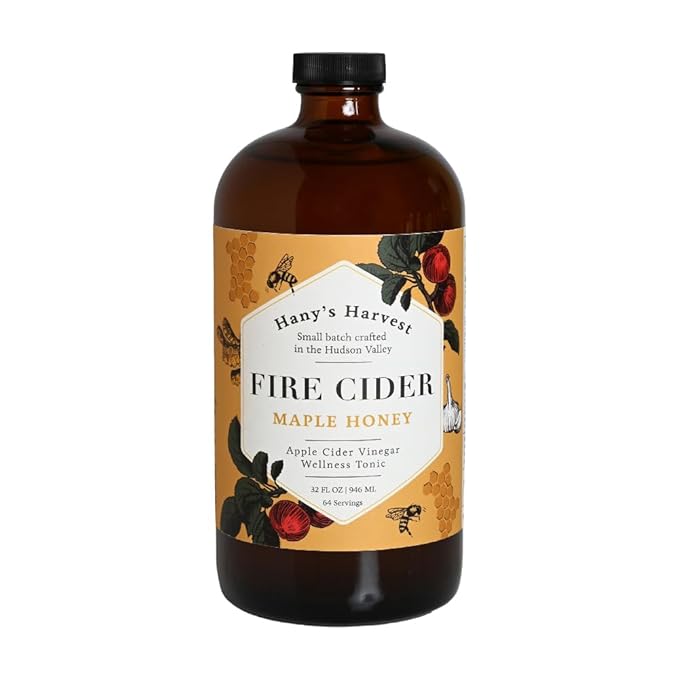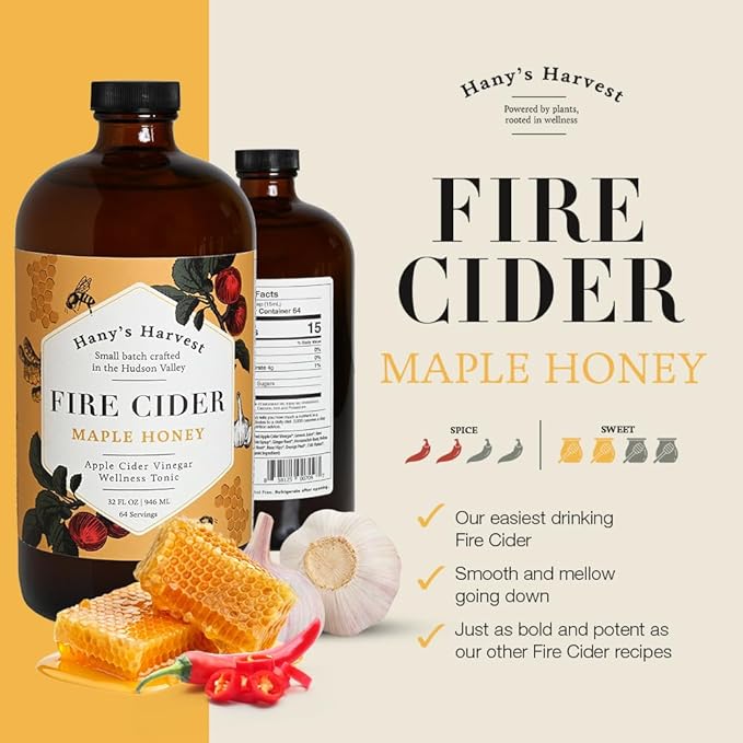- Hany's Harvest Maple Honey Fire Cider: Our Apple Cider Vinegar is a meticulously handcrafted tonic made from apple vinegar, organic unsweetened ingredients, and a blend of natural spices. This carefully crafted small-batch wellness tonic elixir supports your immune system and aids digestion, offering a bold and spicy flavor that adds a zesty kick to your daily wellness routine.