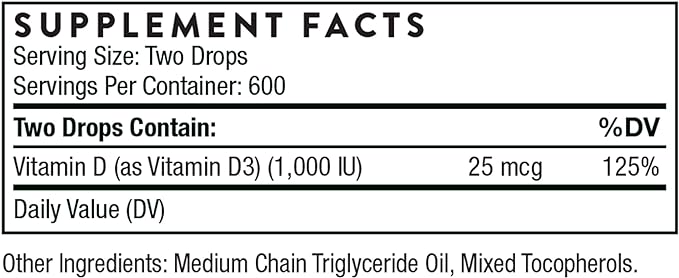 THORNE Vitamin D Liquid - Vitamin D Supplement - Supports Healthy Bones and Muscles, Cardiovascular Health, and Immune Function* - 1 Fl Oz (30 ml)- 600 Servings