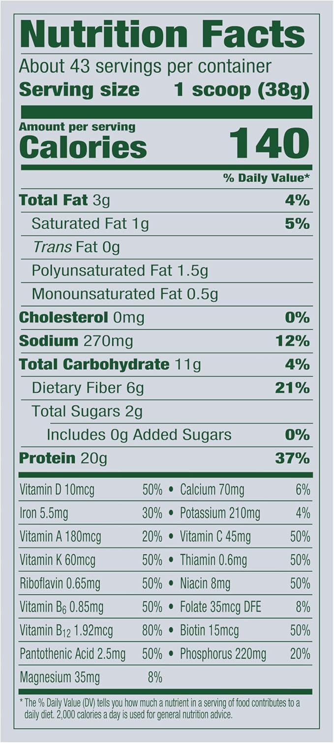 - MORE THAN JUST PROTEIN. 50 percent DV OF 8 vitamins and minerals per serving, plus 4g of fiber, 500mg of Omega-3 ALA, Antioxidant vitamin a and c to support the immune system and Probiotics (2 billion CFUs bacillus coagulans). From real, plant-based ingredients.