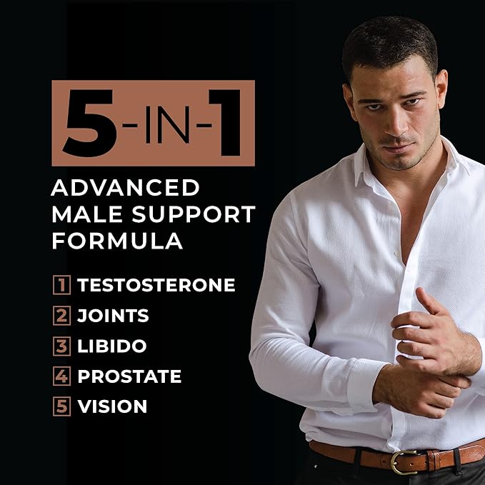 - Powerful 5 In 1 Formula: Premium nutritional supplement provides support for men in 5 key areas as they age: testosterone, libido, joints, prostate, and vision. Signs of low testosterone include decreased libido, persistent fatigue, inability to recover from workouts, increased body fat, reduced muscle mass, and sleep disturbances. Take 3 capsules daily to help take back your youth and be the active guy you want to be in all areas of life. 4-week supply. For maximum results take for 8 weeks.