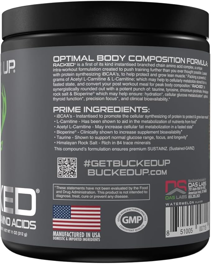 Bucked Up- BCAA RACKED™ Branch Chained Amino Acids | L-Carnitine, Acetyl L-Carnitine, GBB | Post Workout Recovery, Protein Synthesis, Lean Muscle BCAAs That You Can Feel! 30 Servings (Watermelon)