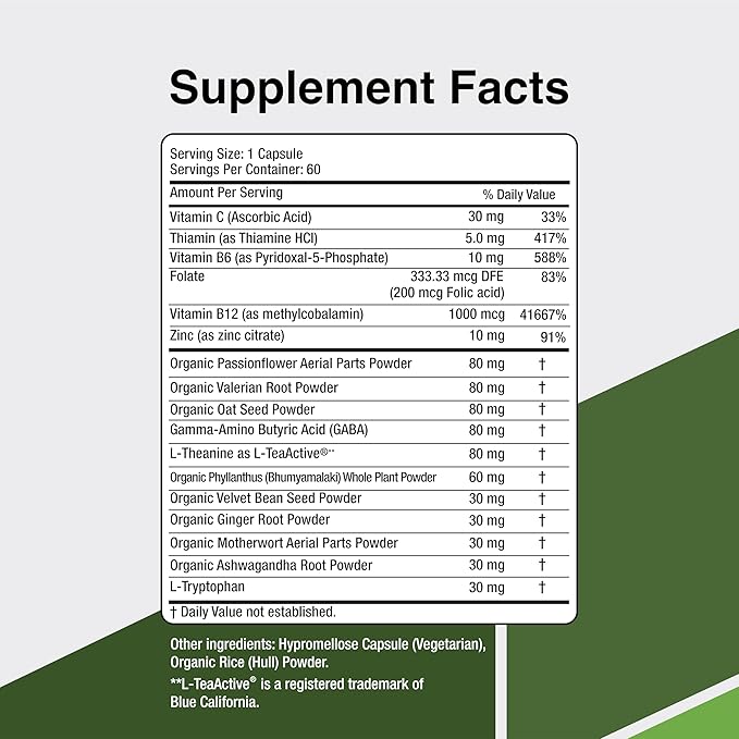 - Natural, organic supplement formulated to help promote calmness and relaxation.