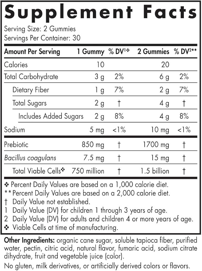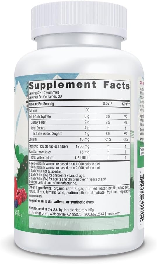 - WHY PROBIOTICS - Kids Nordic Flora Probiotic Gummies provide a synergistic blend of probiotics & prebiotic fiber to help establish and maintain healthy digestive balance with 1.5 billion CFU per serving.