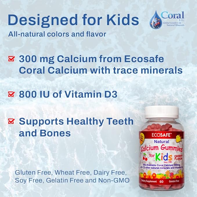- DESIGNED FOR KIDS: Coral LLC's Natural Calcium Vitamin D3 Gummies offer 300 mg of bioavailable calcium derived from EcoSafe, above-sea coral and 800 IU of Vitamin D3 (125 percent of recommended daily value), which together help support healthy bone development, teeth and metabolic function.