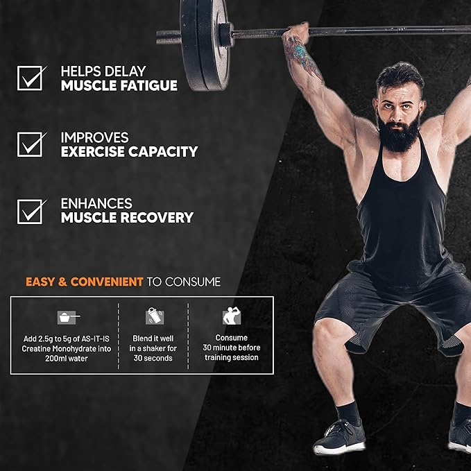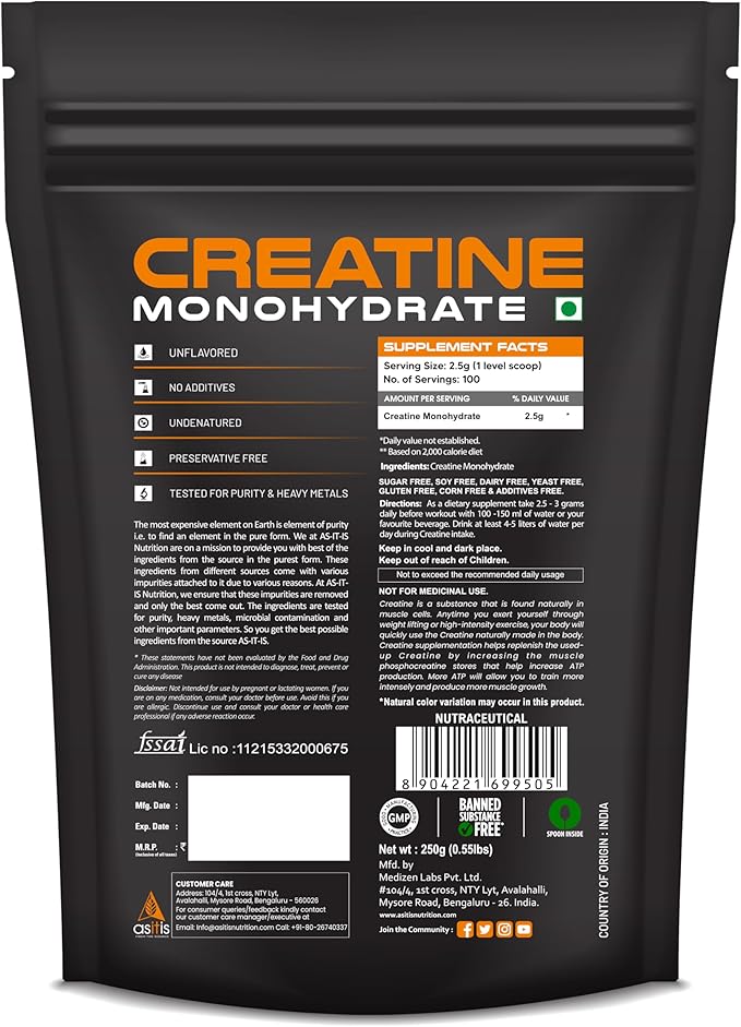 AS-IT-IS Nutrition Creatine Monohydrate 250gms/8.8 Oz | USA Labdoor Certified for Accuracy & Purity Preworkout 2.5g Per Serving Free of Fillers and Preservatives