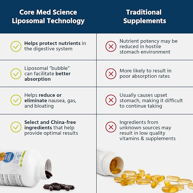 - MAXIMUM ABSORPTION LIPOSOMAL TECHNOLOGY: Unlike traditional supplements, where the active ingredients get destroyed by acids in the digestive tract, Core Med Science uses Liposomal Technology to protect nutrients with a liposomal “bubble” to safely deliver nutrients into the bloodstream for optimal absorption. Provides up to 80% more absorption and is also gentler on your stomach.