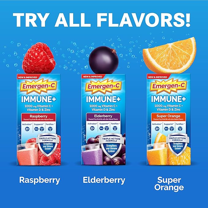 - 50ct of Emergen-C Immune+ Triple Action Immune Support Powder, with 200mg of BetaVia (R), 1000mg Vitamin C per serving, B Vitamins, Vitamin D, Zinc and Manganese (2)