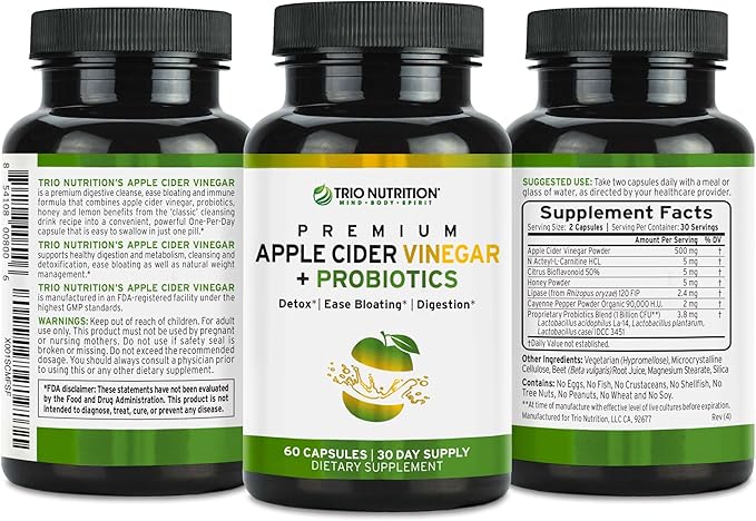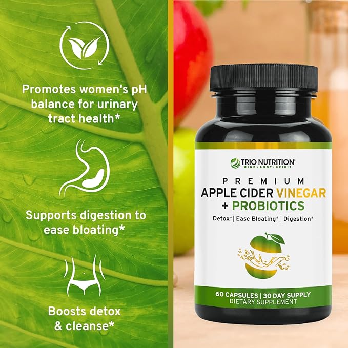 - Say Goodbye To Bloating: Trio Nutrition’s Apple Cider Vinegar with Billions of Multi-Strain Probiotics is a great way to support your digestive health. They help reduce bloating, promote a healthy metabolism, maintain pH balance, and assist with weight management. The ACV Capsules are an easy way to keep your gut health in check and feel great every day.*