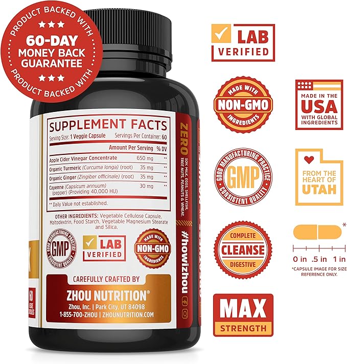 Zhou Nutrition Cider Detox Apple Cider Vinegar Capsules with Ginger, Turmeric & Cayenne, Max Strength Thermogenic Formula for Improved Digestion, Detox, Heart Health