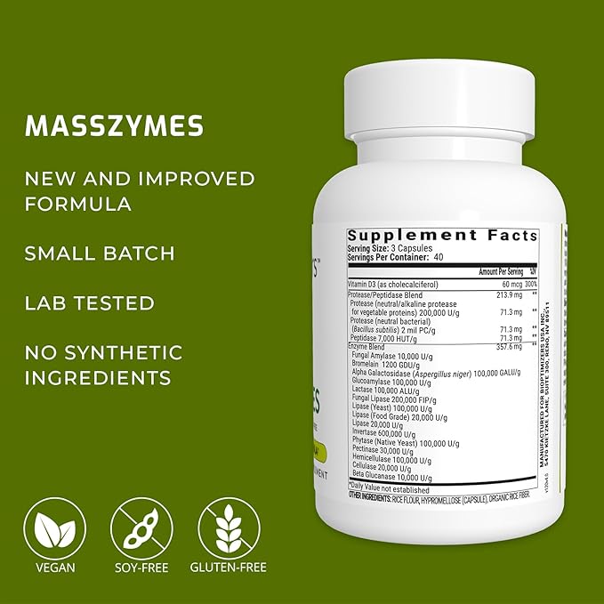 - IMPROVES YOUR DIGESTION: MassZymes 3.0 with AstraZyme is a digestive enzyme supplement that contains proteolytic enzymes. This supplement can help provide better absorption of amino acids that feed your body, therefore helping alleviate constipation, bloating, and gas relief.