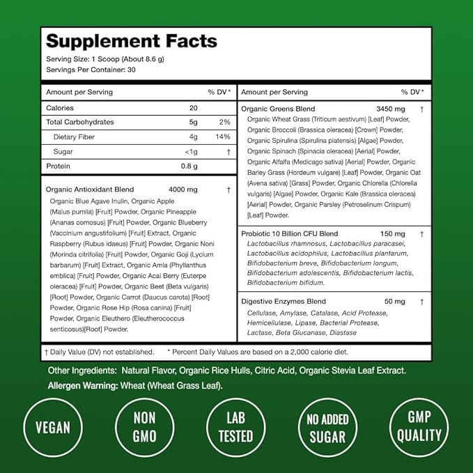 - Over 40 Nourishing Nutrients - Loaded with organic ingredients, Super Greens is truly so much more than a basic “greens powder”. As if it's Organic Greens Blend wasn’t enough, you get a huge antioxidant blend of fruits & veggies to top it off. Last & certainly not least, key enzyme & probiotic blends deliver digestive support to ensure you’re giving your gut what it needs to absorb all of this goodness & keep you feeling amazing.