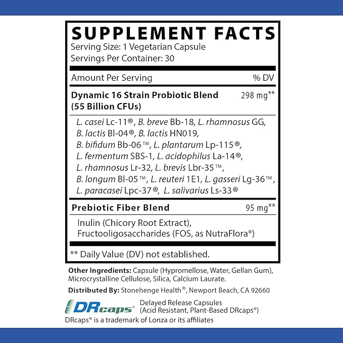 - 🌱 Stonehenge Health Dynamic Biotics - 16 Unique Probiotic Strains, 55 Billion CFUs & NutraFlora Prebiotic Fiber with NO FILLERS, BINDERS, OR SYNTHETIC INGREDIENTS: Specially designed vegetarian capsules to aid in the safe delivery of the potent probiotics directly into the gut, resisting premature stomach acid breakdown