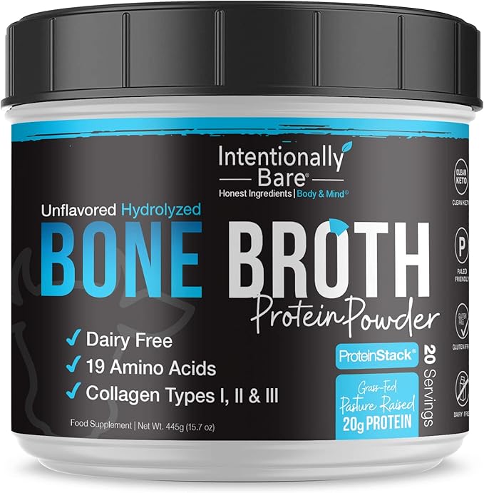 Intentionally Bare Bone Broth Collagen Peptides Powder Unflavored - Dairy Free Collagen Peptide Powder Type 1 & 3 - Pasture Raised & Grass Fed Collagen Protein Powder for Gut & Joints - 20 Servings