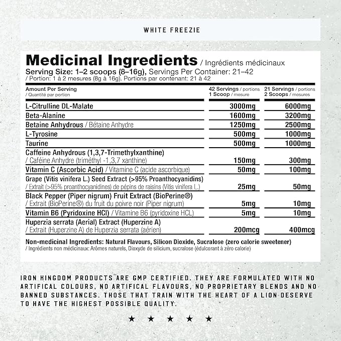 Iron Kingdom Pre Workout Powder for Men & Women Caffeine, Beta Alanine & Aminos for Intense Focus Endurance & Pump - Preworkout Energy Drink Powder Natural White Freezie - 42 Servings