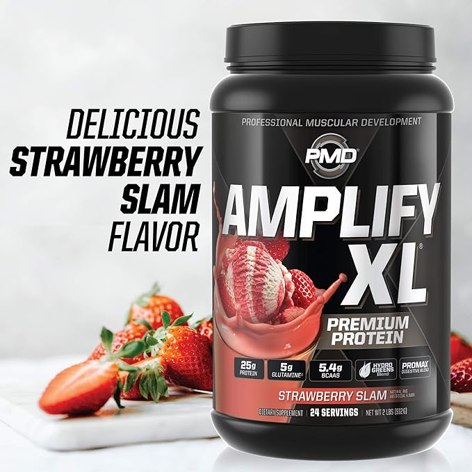 PMD Sports Amplify XL Premium Whey Protein Supplement Hydro Greens Blend - Glutamine and Whey Protein Matrix with Superfood for Muscle, Strength and Recovery - Strawberry Slam (24 Servings)