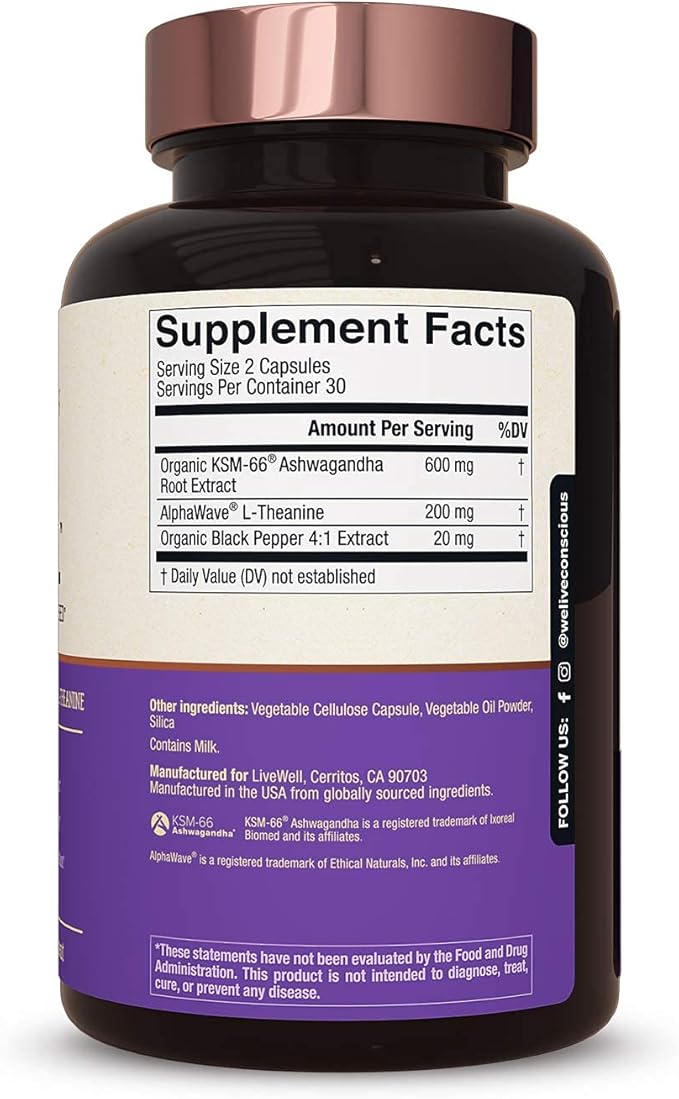 Live Conscious KSM-66 Ashwagandha Supplement w/L Theanine & AlphaWave - ZenWell Everyday Stress Relief, Mood Support, Cognitive, Brain Health - Ashwagandha for Men & Women - 60 Capsules