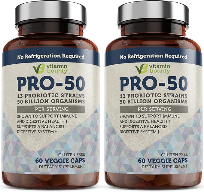 Vitamin Bounty Pro-50 Probiotic - 50 Billion Organisms and 13 Probiotic Strains that Promote Gut Health, Digestive Health Probiotic, Delayed Release Capsule with Prebiotic Greens - 60 Capsules, 2 Pack