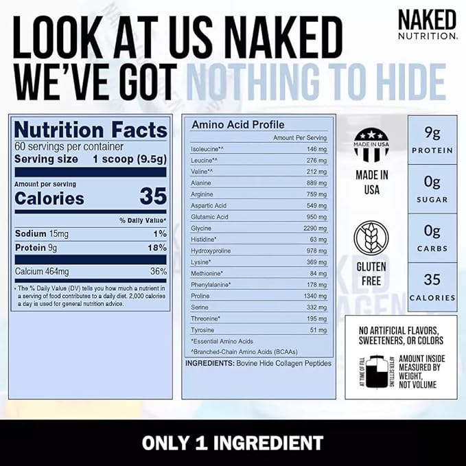 - ONLY ONE INGREDIENT & THIRD PARTY TESTED: Our collagen hydrolysate has no artificial sweeteners, flavors, or colors and is GMO-Free, Growth Hormone Free (no rBGH or rBST), Soy Free and Gluten-Free while being a Paleo friendly and Keto collagen protein powder. As with all Naked Nutrition products, our grass fed collagen powder is independently third-party tested for purity, safety from heavy metals contamination and nutritional value.