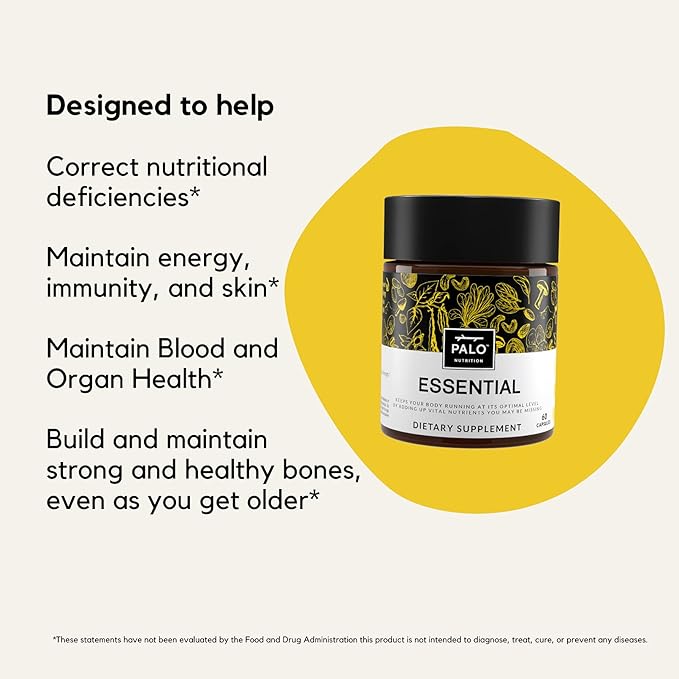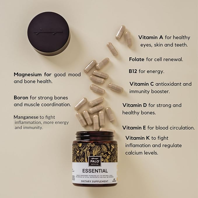 PALO Essential+ Adult One Daily Ritual Multivitamin with Vitamins D3, K2 (as MK7), B12, E, Folate, Minerals Boron and Magnesium and More (60 Capsules, 2 Month Supply)