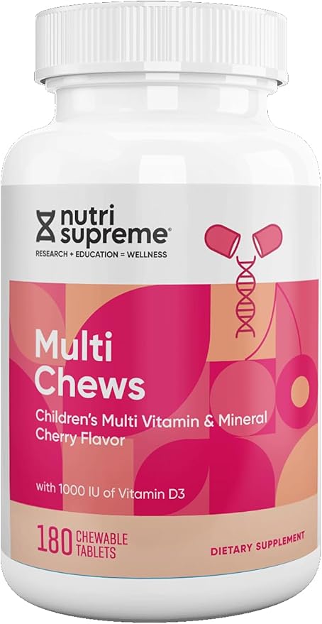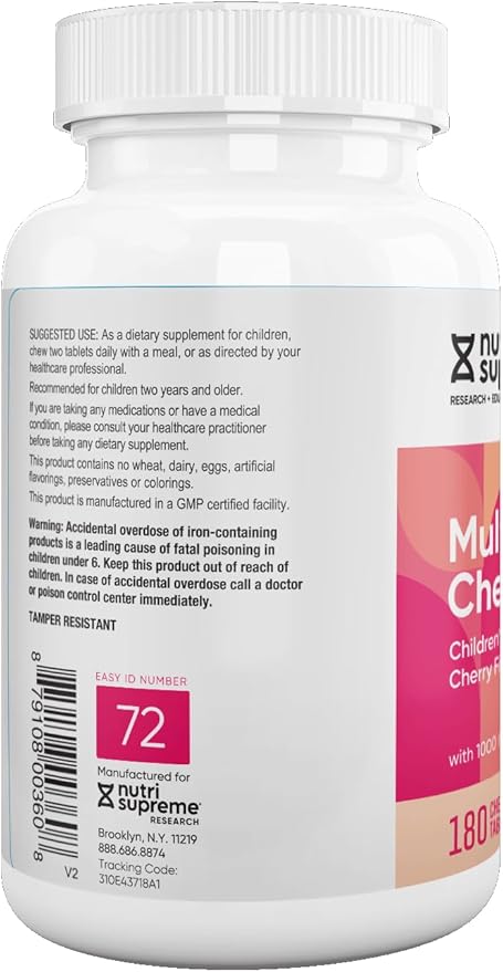 Delicious Kids Multivitamin, 180 Vegetarian Chews – Complete Children’s Supplement with Essential Vitamins and Minerals - Vitamin A, B, C, D3, Calcium, Iron, Folic Acid, Zinc – Cherry Flavor