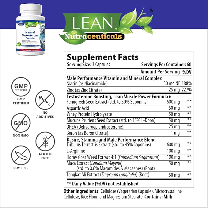 - WORKOUT SUPPLEMENT FOR MEN: Gain lean muscle with natural ingredients Horny Goat Weed for men, Tongkat Ali, Tribulus Terrestris, L-arginine, Fenugreek, Mucuna Pruriens, Maca Root, DHEA, Boron, D Aspartic Acid, Zinc, Niacin, Whey Protein Powder