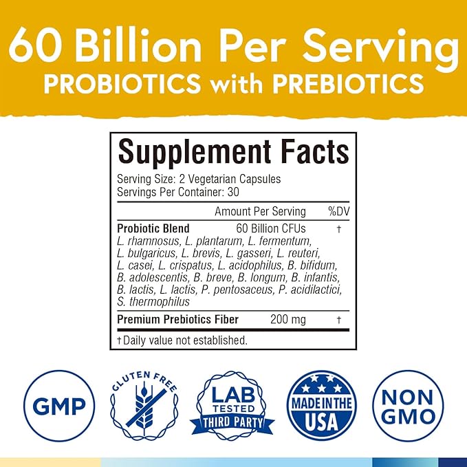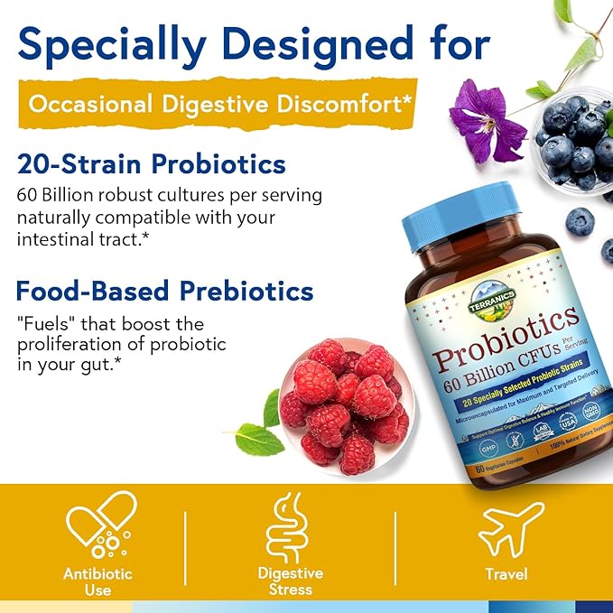 - Shelf Stable Probiotic with Prebiotic: Terranics Probiotics 60 Billion CFU are formulated with Delayed Release Technology, which allows high potency probiotics survive stomach acid and reach your intestinal tract effectively. Our probiotics do not necessarily require refrigeration, so they are convenient at home or for travel.