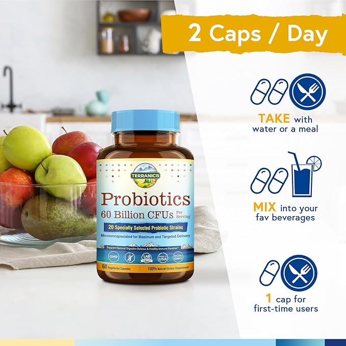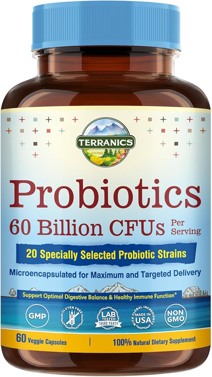 Terranics Probiotics 60 Billion CFU, 20 Strains, 60 Veg Capsules, Prebiotics & Probiotics, Shelf Stable Probiotic Supplement for Men & Women, Digestive & Immune Health, Non-GMO, NO Soy, Dairy & Gluten