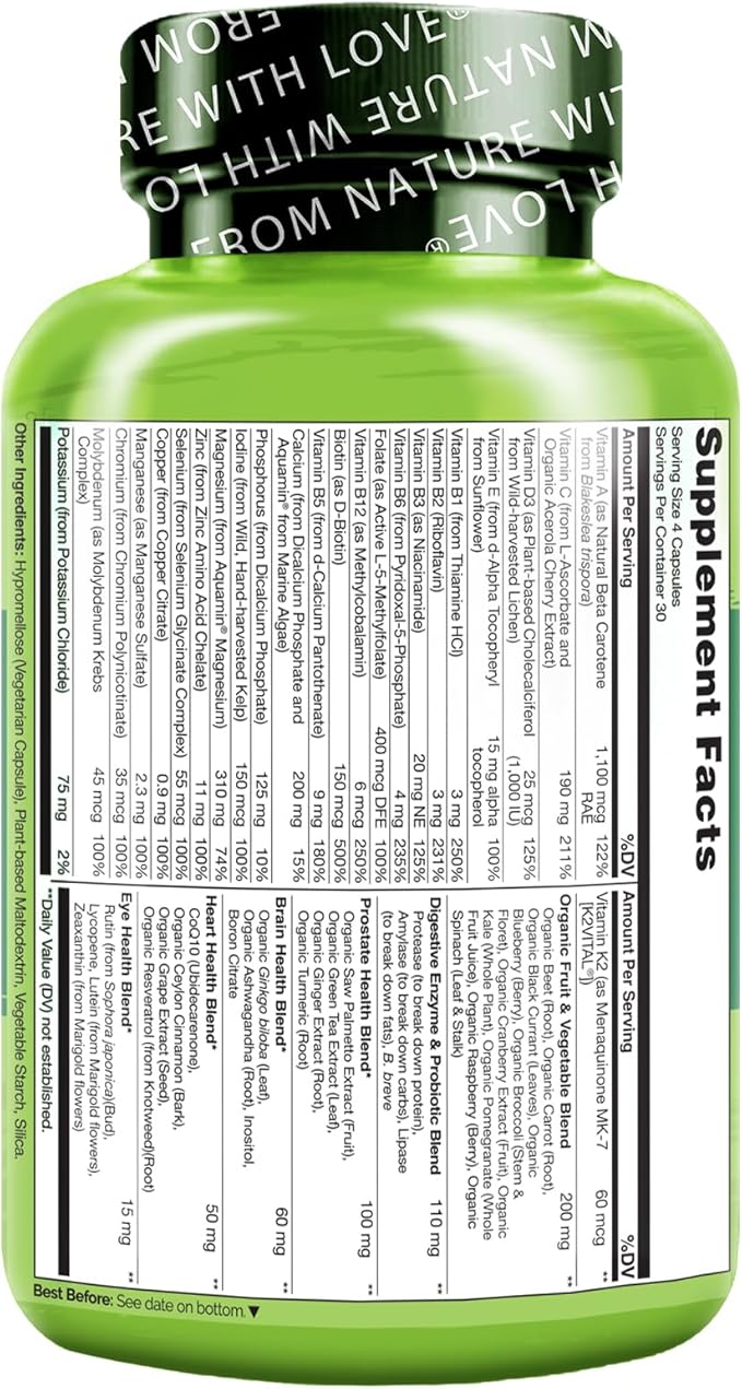 - Antioxidant Superfoods: Our formula includes antioxidant-rich herbal extracts like gingko, turmeric, ginseng, saw palmetto, ashwagandha, and lutein to support your brain health, heart health, eye health, and prostate health.