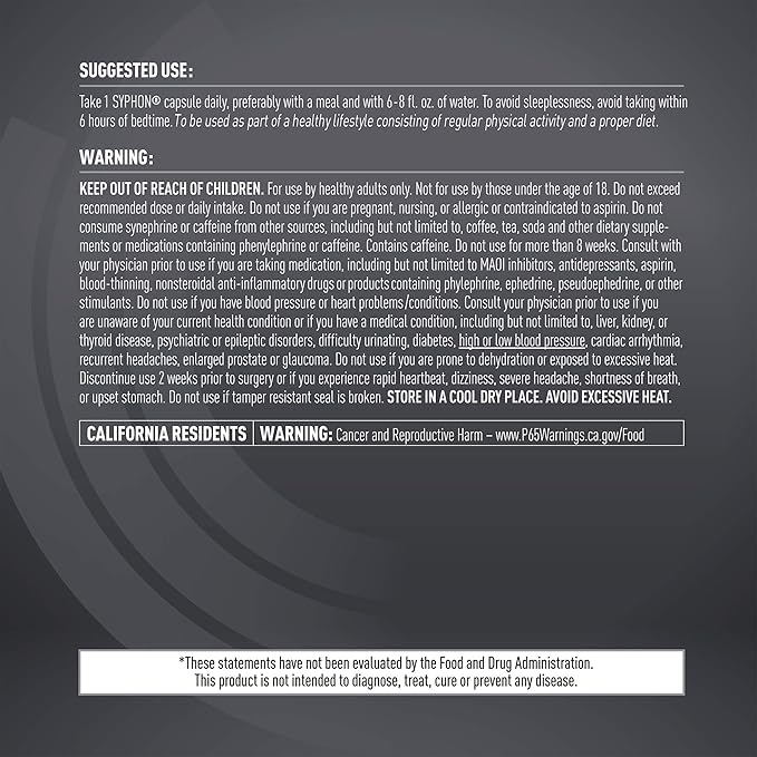 - Daily Energy And Focus: This enriched thermogenic formula features a high-quality blend of ingredients that provide intense energy, focus, and mental performance. SYPHON is just 1 capsule a day, so use it to help jumpstart your body and perform at peak levels daily.