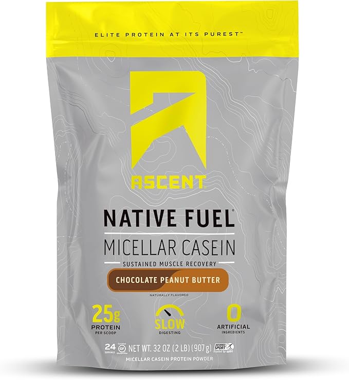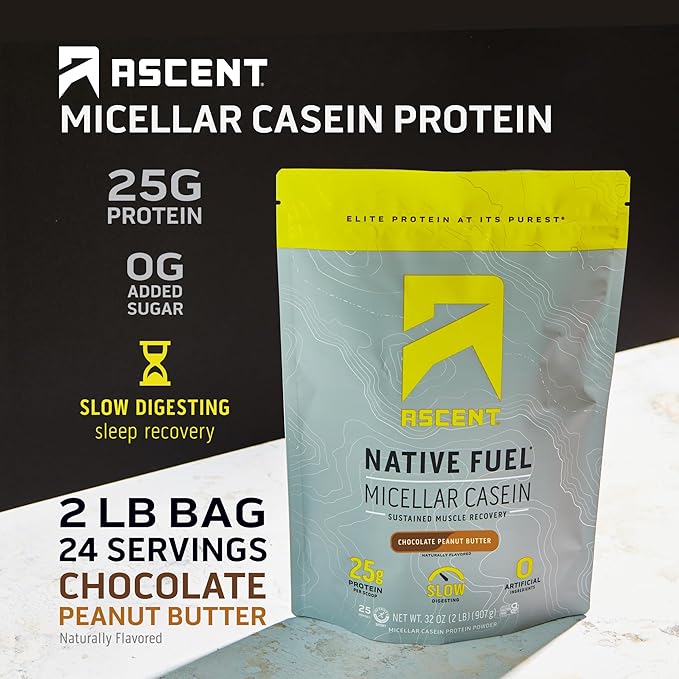 Ascent Casein Protein Powder - 25g Micellar Casein Powder with Zero Artificial Flavors & Sweeteners, Gluten Free, No Added Sugar, 4.9g BCAA, 2.2g Leucine - Chocolate Peanut Butter, 2 Pounds