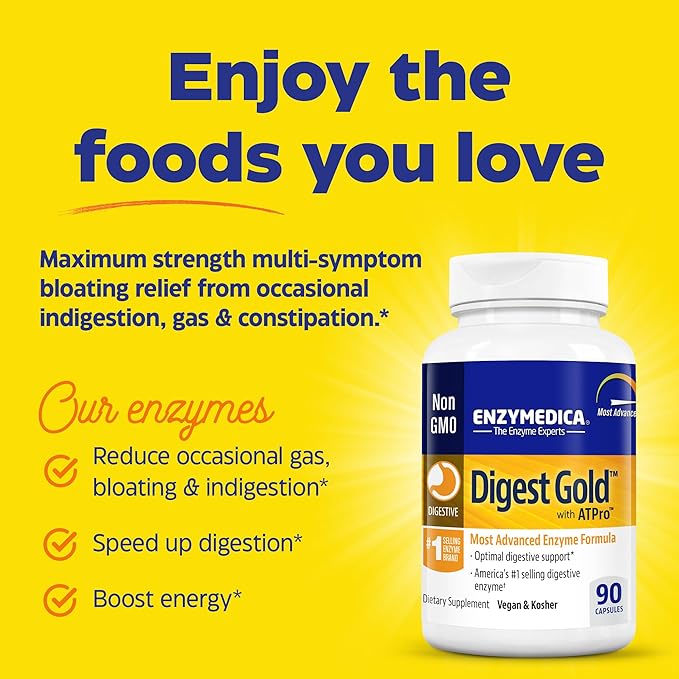 Enzymedica Digest Gold + ATPro Maximum Strength Digestive Enzymes | Prevents Bloating Gas & Indigestion, Natural Digestion Support, Multi Enzyme Amylase, Protease, Lipase & Lactase, 90 Capsules