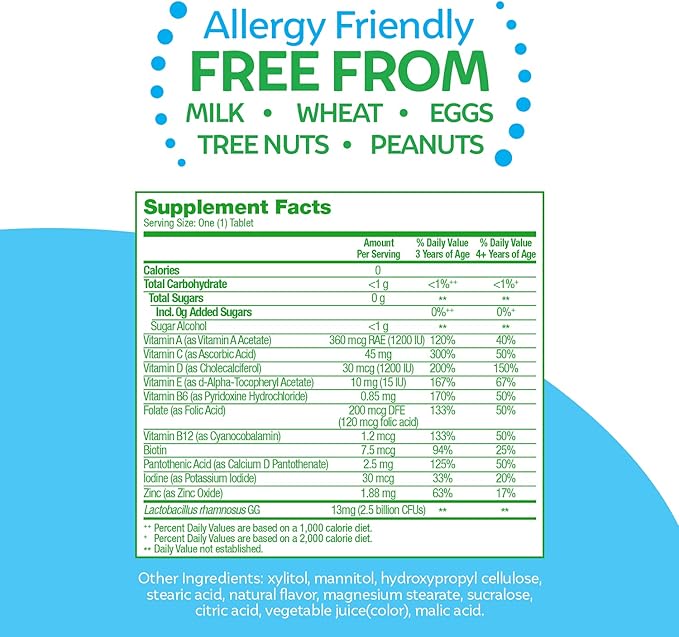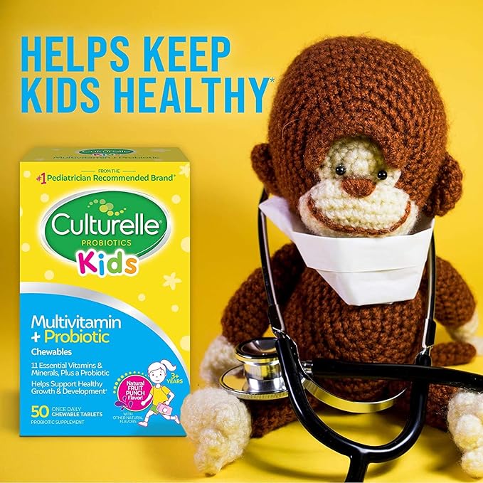 - SAFE & EASY TO TAKE: Delicious fruit punch-flavored chewable tablet. Chew one (1) Culturelle Kids Complete Multivitamin + Probiotic tablet daily; can be taken with or without food at any time of the day