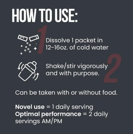 - Suggested Use :- Dissolve 1 packet in 12-16oz. of cold water & shake/stir vigorously and with purpose. Can be taken with or without food.