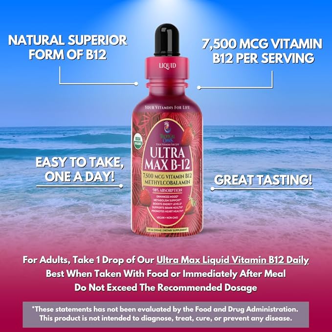 - Maximum Strength 7500mcg Organic Vitamin B12 Drops. Ultra Max B12 Contains 7500mcg of Liquid Vitamin B12 in every drop, that's over 312,000% Daily Value! Our Super Potent Formula promotes natural energy to help fight fatigue so you can feel great all day.