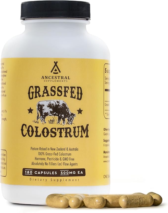 Ancestral Supplements Grass Fed Beef Colostrum Supplement, 3000 mg, Offers Immune Support and Promotes Gut Health, Athletic Performance, Healthy Iron Levels, Growth and Repair, Non GMO, 180 Capsules