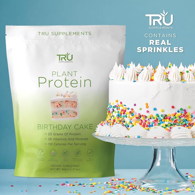 TRU Plant Based Protein Powder, BCAA, EAA, 20g Vegan Protein, 100 Calories, 27 Vitamins, No Artificial Flavors 25 Servings (Birthday Cake)